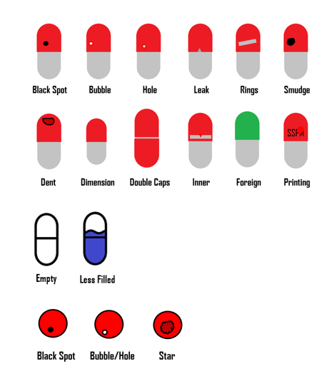 頂凹、空囊、部份充填、插劈、開裂、未鎖緊、氣泡、黑點、圖案印刷不良、異種膠囊等各種缺陷